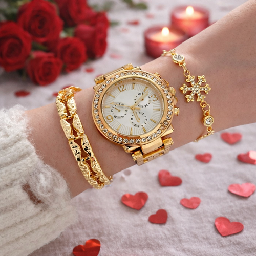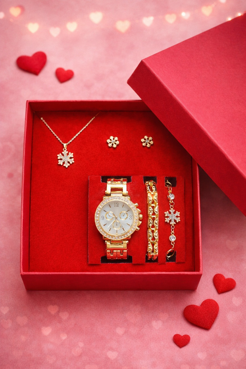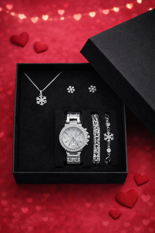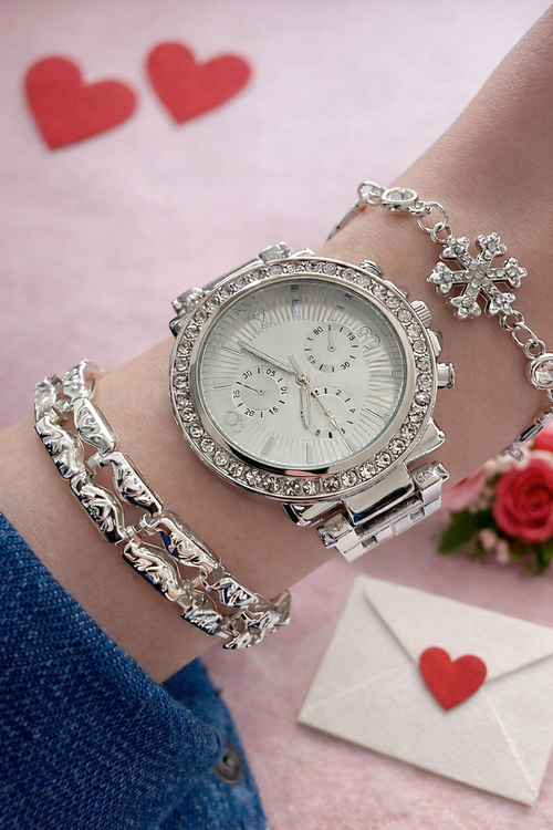 Gümüş renk tasarımı ve zarif detaylarıyla öne çıkan bu kadın saat seti, günlük kombinlerinize şıklık katmak için tasarlandı. Işıltılı saat ve uyumlu bileklikleri ile stilinizi tamamlayan modern bir aksesuar setidir.